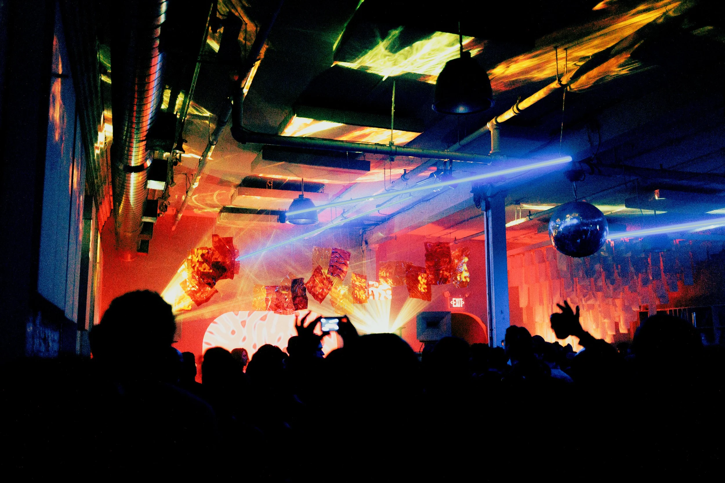 When projections move across their surfaces, the work comes alive. Light bends and fragments, changing as people move through the space. The installation becomes a living environment that mirrors the energy of a crowd in motion, the pulse of music, and the sensation of standing under a sky that never stops changing.